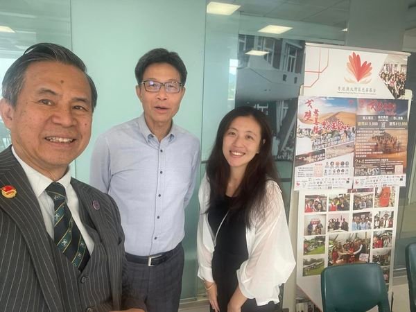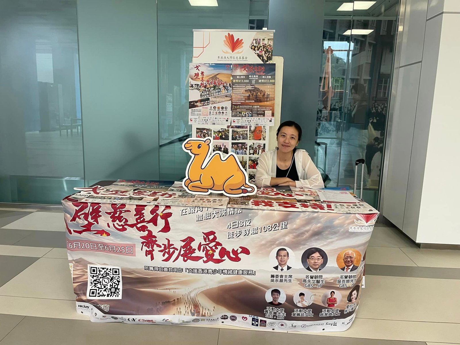 今日下午,粵港澳大灣區慈善基金與香港浸會大學(浸大)合作,在浸大逸夫校園舉行了一場別開生面的「戈壁慈善行」介紹活動。浸大碩士學生Angela在校園擺設攤位,向師生介紹這一充滿挑戰與意義的公益活動。活動期間, 戈壁慈善行活動發起人——吳永基先生意外遇到兩位好朋友——香港浸會大學副校長周偉立博士和學生事務處輔導長霍廣賢教授,兩位貴賓也熱情支持並與我們合影打卡。
